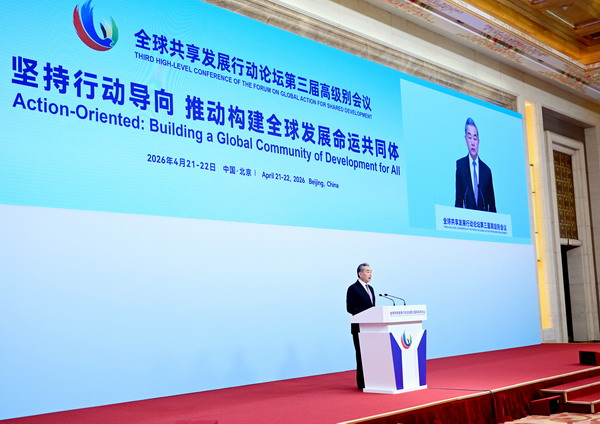 2026年4月22日,全球共享发展行动论坛第三届高级别会议在京举行。中共中央政治局委员、中央凯发k8主任王毅出席开幕式并致辞。